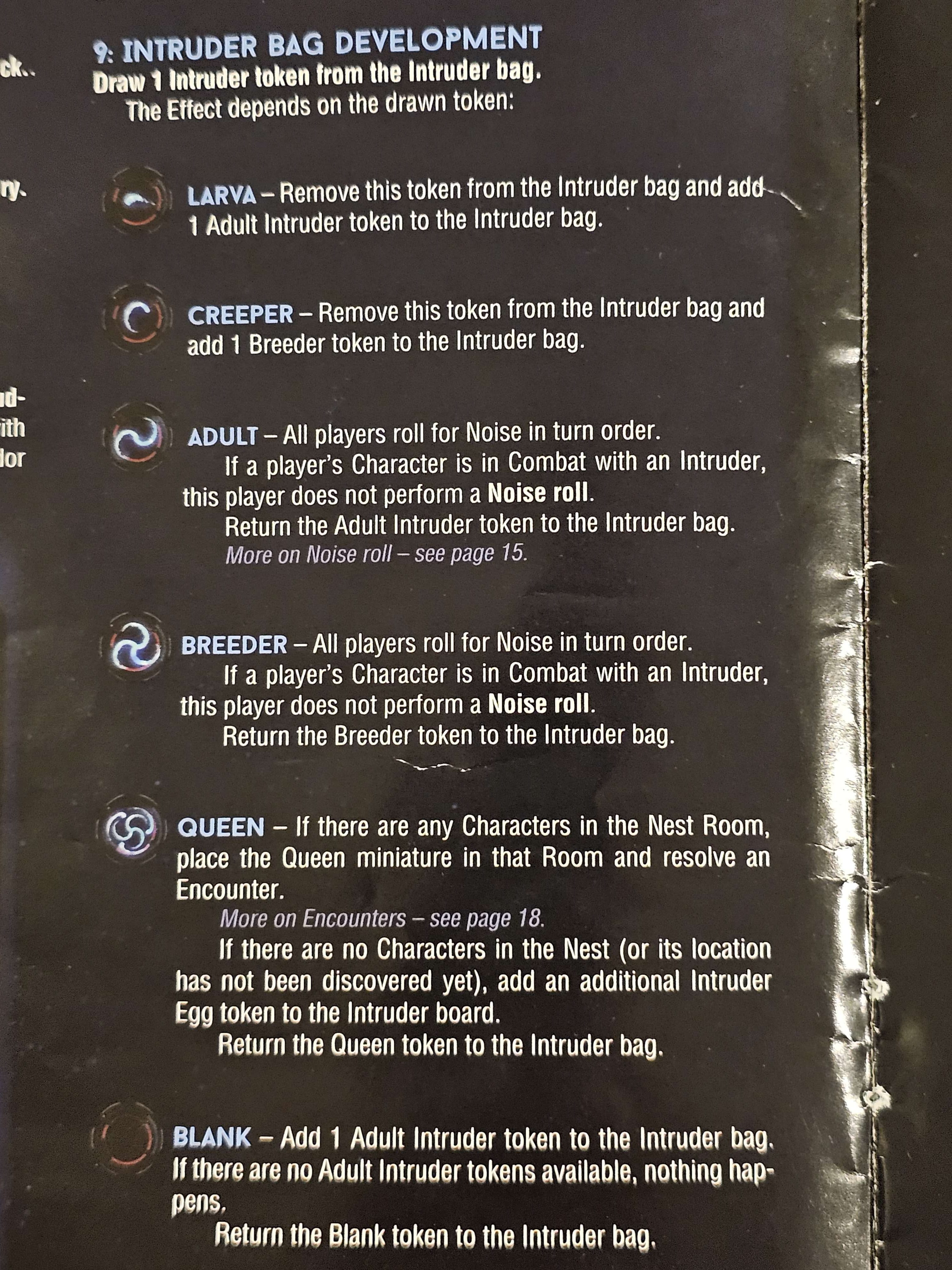 During INTRUDER BAG DEVELOPMENT you draw one of these tokens out of the bag at random and do what this fun little chart says: