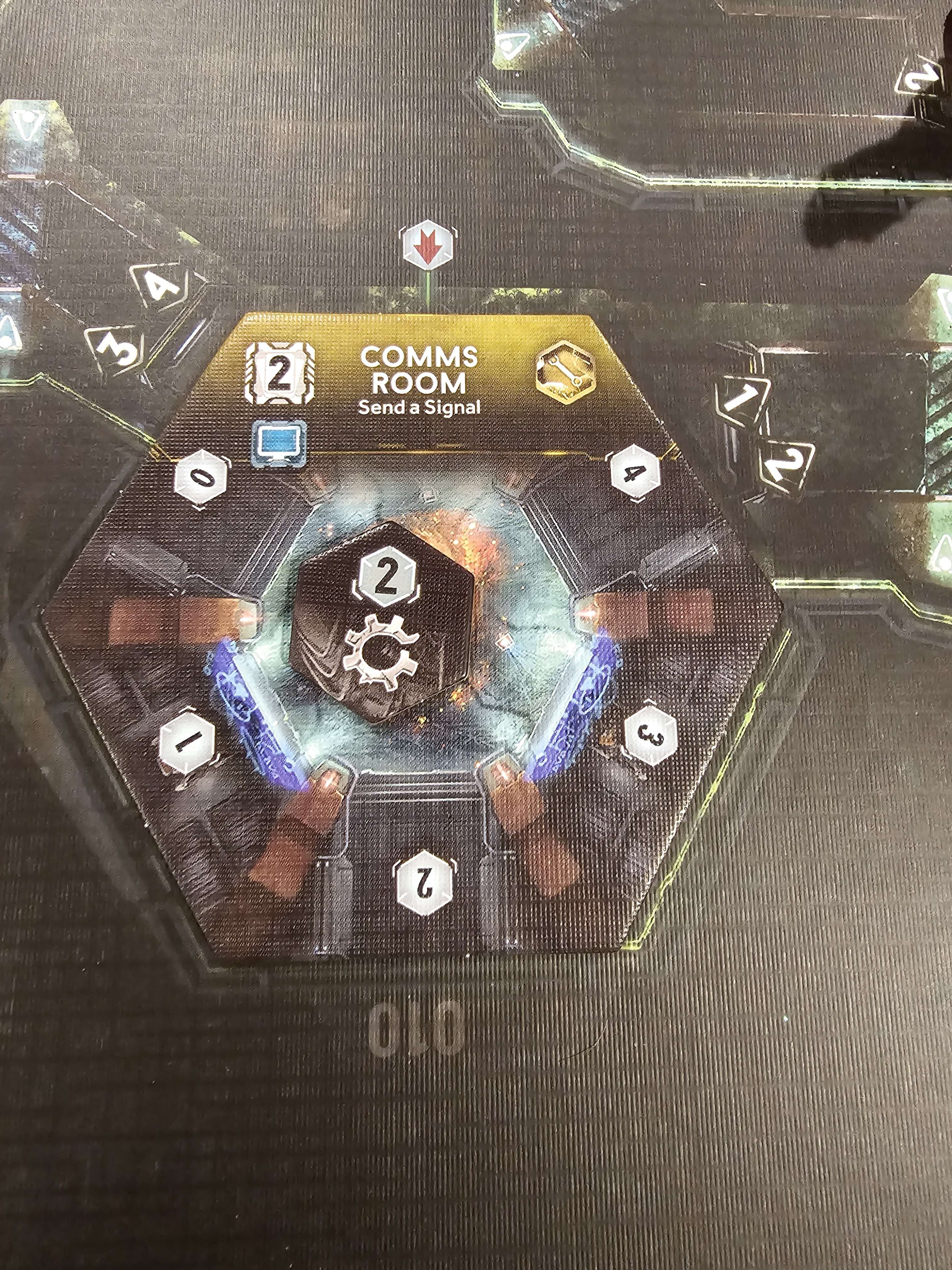 If we look at this example, we can see that this tile is the Comms Room. It has a 2 card action that allows you to “Send the Signal,” which is one of the objectives you can get. We can also see that it has a little blue computer symbol, which interacts with other cards and events. Then it has the numbers 0-4, which represent the amount of items, which is shown on exploration token along with a gear symbol. This gear symbol means that the room is malfunctioning and the room action can not be used until repaired. Lastly, the room is yellow at the top, which represents what kind of items the player can search for. The other two types being red and green.