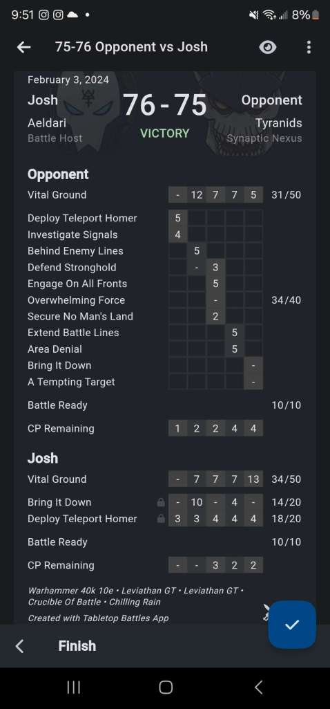 Ignore the CP usage, we tracked it with dice in the game like all gentlemen do. And it was Invasion Fleet, not Synaptic. Yes my phone was at 8%, mind your own business.
